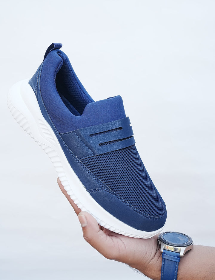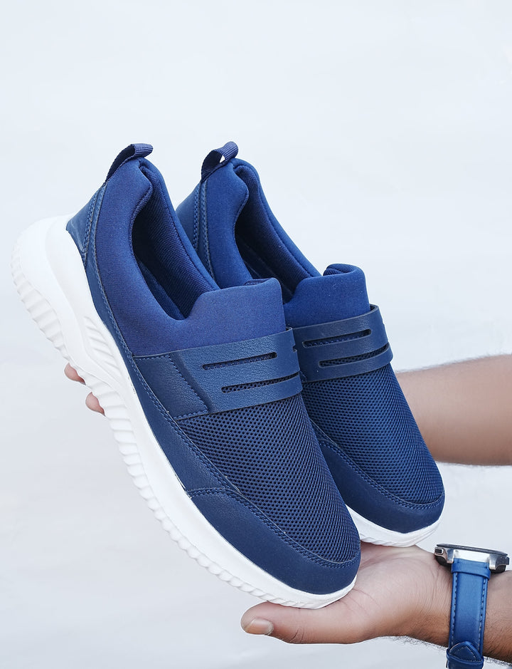 Dive into effortless style with our Azure Glide Slip-On Sneakers. These sneakers boast a navy blue hue paired with a contrasting white sole for a fresh, nautical look. The slip-on design ensures easy wearability, while the lightweight fabric provides breathability and comfort for all-day use. Ideal for the fashion-forward individual on the go, these sneakers offer a perfect blend of convenience and style.
