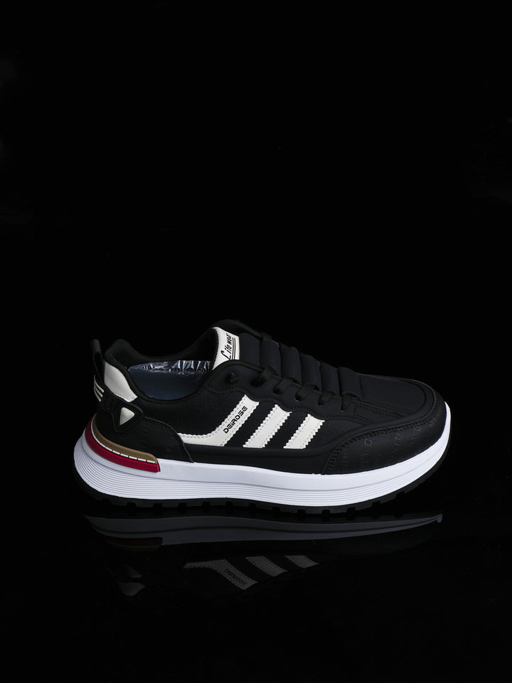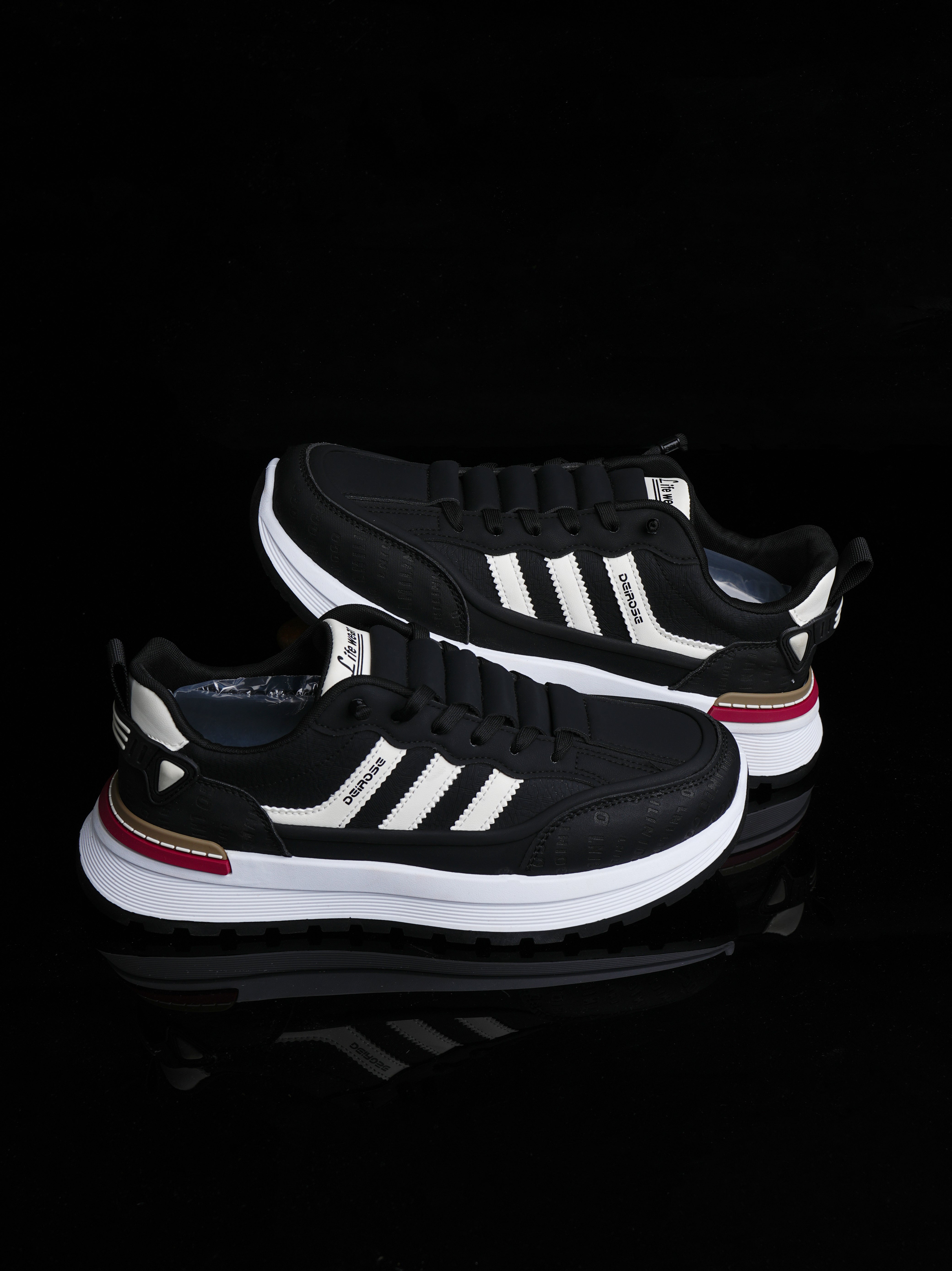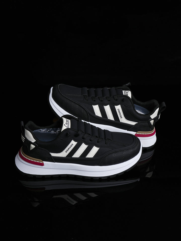 Step into a timeless look with the 'Heritage Stripe' men's sneaker. This shoe captures the essence of classic sport footwear with its iconic black and white contrast and recognizable three-stripe pattern. It's the perfect blend of retro style and modern comfort, making it a staple for any streetwear enthusiast or anyone seeking a reliable daily shoe.