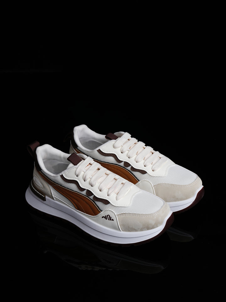 | Material (Upper) | Combination of Breathable Mesh (white) and Suede-Look Synthetic Overlays (beige/brown). Ensures ventilation and a premium, textural finish. |