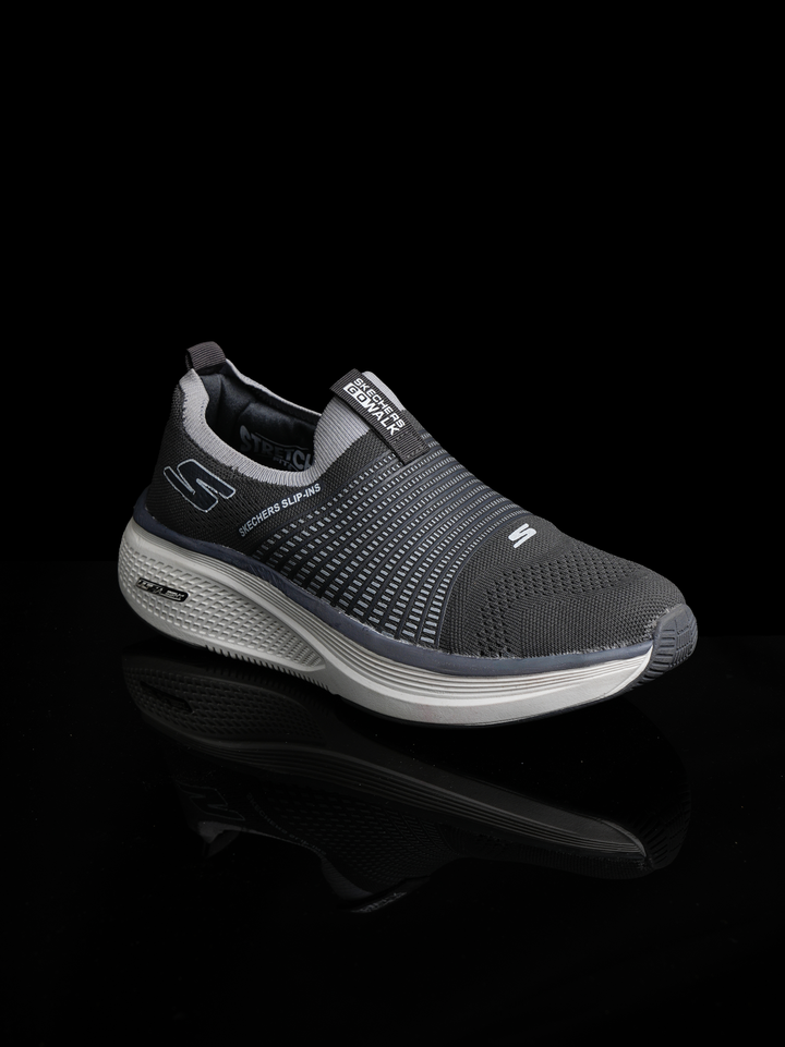 A men's or unisex dark grey slip-on walking shoe that combines the convenience of Hands-Free Slip-ins with podiatrist-certified Arch Fit support and the lightweight comfort of Skechers GO WALK technology. It is designed for maximum support and all-day, active walking.